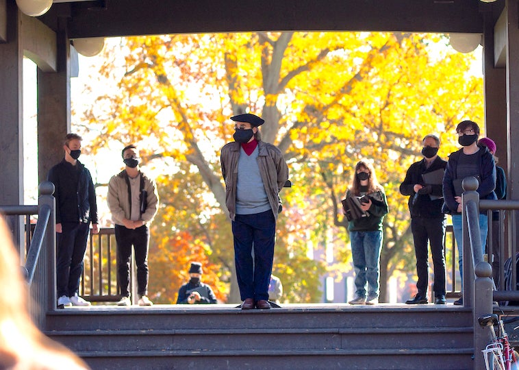 Professor Steven Plank leads Collegium Musicum in ‘‘Palestrina from the Porch’’ on Clark Bandstand in Tappan Square.