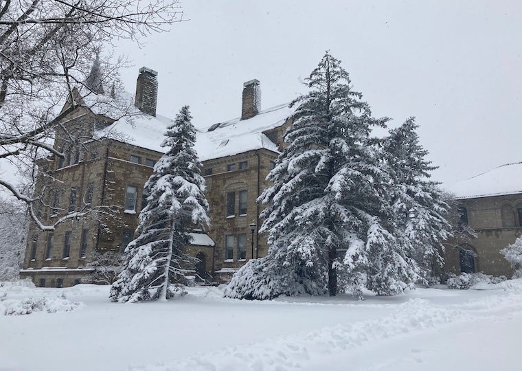 Oberlin’s first major snowfall on December 1 draped buildings, pathways, and tree branches.