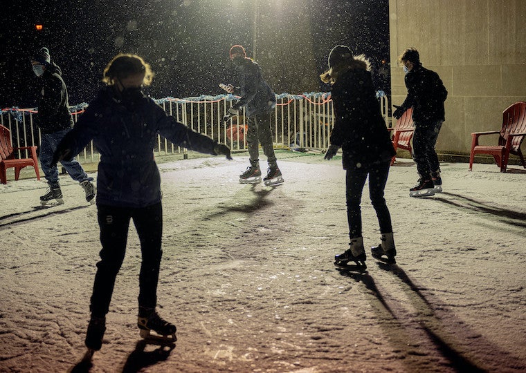 An ice tower, fire pits, music, hot beverages, snacks, and a skating rink greeted members of the Oberlin College community in Wilder Bowl in early February. The TGIF event is an effort to create a space for the campus to safely gather. Winter Oberland will continue through mid-March and is open to those in Oberlin’s testing protocol.