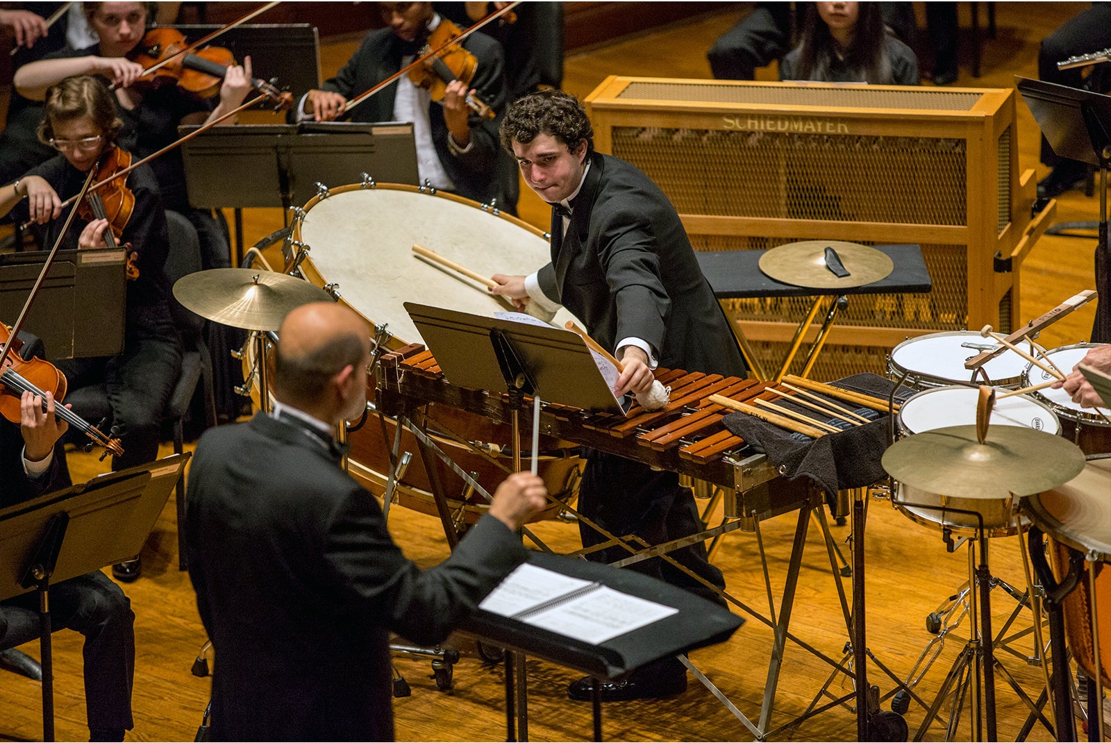 A student percussionist performs with the Oberlin Orchestra on tour at Carnegie Hall.