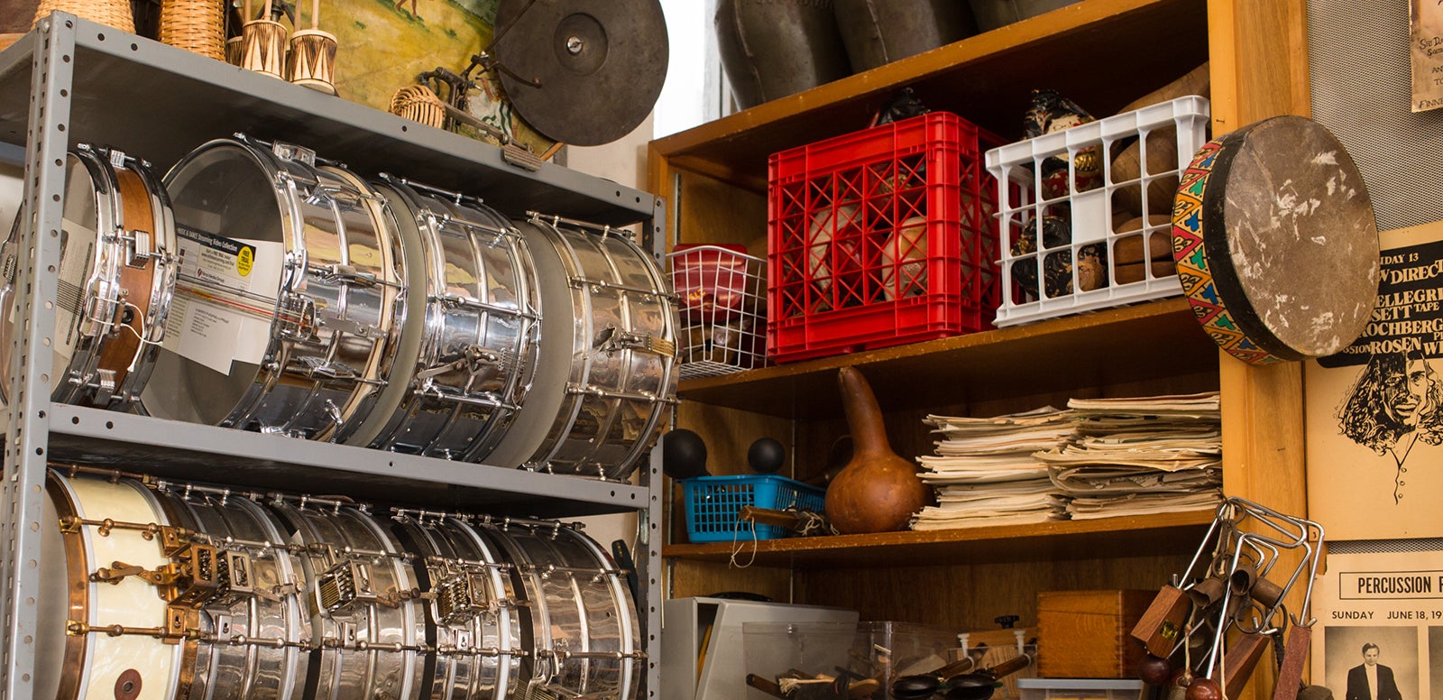 Students have access to this impressive array of professional-quality instruments which include several sets of clutch and balanced-action timpani (Spenke, Clevelander, and Ludwig), five marimbas (Kori, MarimbaOne, and vintage instruments), four vintage xylophones, four vintage glockenspiels, tubular bells, and vintage vibraphones. There is also an extensive collection of vintage and modern snare drums in a variety of depths and styles. You’ll also find our unique library of chromatic and untuned metallic instruments such as gongs, tam tams, crotales, almglocken, cymbals, as well as shelves of piece-specific instruments too numerous to describe! Follow @oberlinpercussion on Instagram for explorations of this historic collection of instruments.