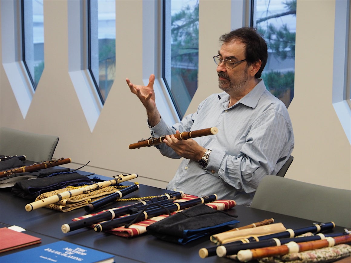 Professor Michael Lynn shows one of the instruments in his collection of historical instruments that includes flutes and recorders.